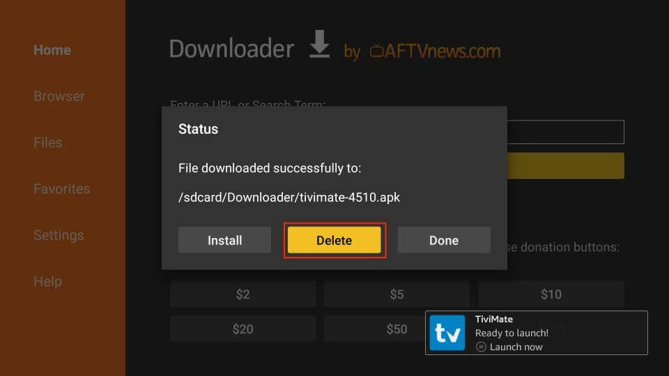 - Remove Installation File: To save space, select Delete to remove the TiviMate APK file from your device, and confirm the deletion by clicking Delete again.